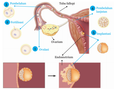 Apabila ada sel sperma yang masuk ke dalam saluran reproduksi perempuan, sel sperma tersebut akan bergerak menuju sel telur. Apabila telah bertemu dengan sel telur, bagian kepala sperma akan masuk ke dalam sel telur dan meninggalkan bagian ekornya di luar sel telur. Proses inilah yang mengawali terjadinya fertilisasi. Fertilisasimerupakan proses peleburan inti sel sperma dengan inti sel telur sehingga membentuk zigot. Proses fertilisasi ini terjadi di dalam tuba fallopi.Zigot yang terbentuk setelah terjadinya fertilisasi akan melakukan pembelahan, selanjutnya berkembang menjadi embrio yang akan menuju ke rahim kemudian tertanam (implantasi) ke dalam endometrium. Pada kondisi ini seseorang mengalami kehamilan.