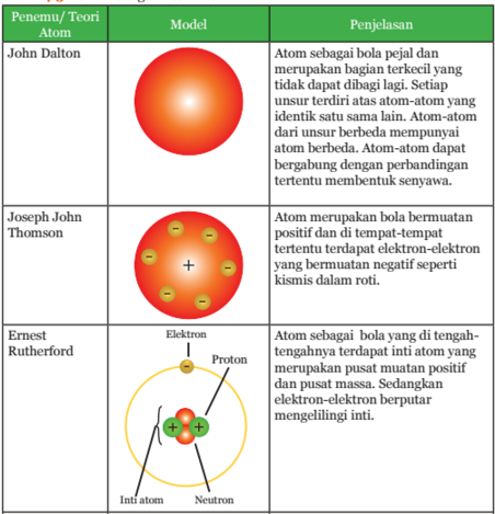 Selain disusun oleh molekul yang berbeda, sifat-sifat suatu materi atau benda yang berbeda juga dapat disebabkan oleh perbedaan susunan molekul-molekul dalam materi itu. Ada beberapa teori perkembangan atom, yaitu teori Dalton, Thomson, Rutherford, Bohr, dan teori atom modern.Partikel subatom, misalnya elektron banyak digunakan dalam berbagai bidang, misalnya dalam mikrokskop elektron dan sinar-X. Setiap atom memiliki nomor atom dan nomor massa. Nomor atom menunjukkan jumlah proton, sedangkan nomor massa menunjukkan penjumlahan proton dan neutron. Molekul dan atom yang menerima atau melepas elektron menjadi bermuatan dan membentuk ion.
