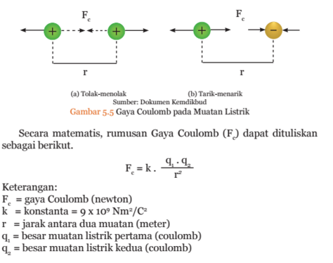 1. Muatan Listrikjika benda bermuatan listrik positif didekatkan dengan benda bermuatan listrik negatif maka akan saling tarik menarik. Sebaliknya, jika benda bermuatan listrik positif didekatkan dengan benda bermuatan listrik positif, atau benda bermuatan listrik negatif didekatkan dengan benda bermuatan listrik negatif akan saling tolak menolak. Interaksi kedua muatan tersebut merupakan gejala sederhana listrik statis.